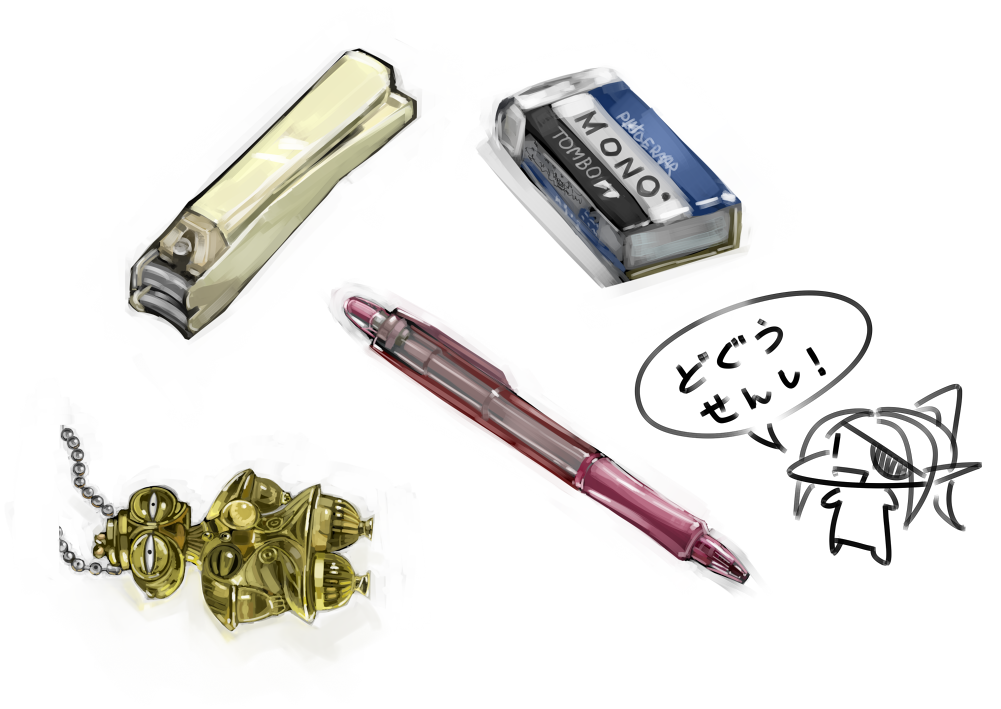 つめきり、消しゴム、シャーペン、どぐうせんし、エレクトラ。